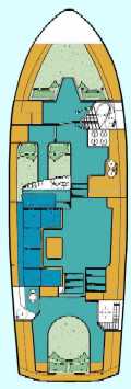 Rechts die Aufteilung des Innenraumes. Vom hinteren Deck gelangt man über eine Treppe in den Salon mit gemütlicher Sitzecke, Schiffsbar, Getränkekühlschrank, Fernseher, DVD Player, Stereoanlage und Klimaanlage. Etwas erhöht ist der Innensteuerstand. Zwei Niedergänge führen in die Kapitänskabine und in die Kombüse. Die Küche hat Kühlschrank, Elektroherd, Gasherd, Mikrowelle und Dunstabzugshaube. Ein Durchgang führt von hier in das Vorschiff zu den beiden Doppelkabinen. Alle Betten haben eine Länge von zwei Meter. Beide Kabinen haben einen eigenen Eingang in die gemeinsame Naßzelle mit Dusche und WC.